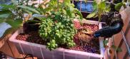 Der Fischtank dient als Puffer, gibt das Wasser dann relativ gleichmäßig per Schwerkraft in das 150 Liter Kompostbed ab, wo alle Feststoffe landen und von Würmern zerkleinert werden.