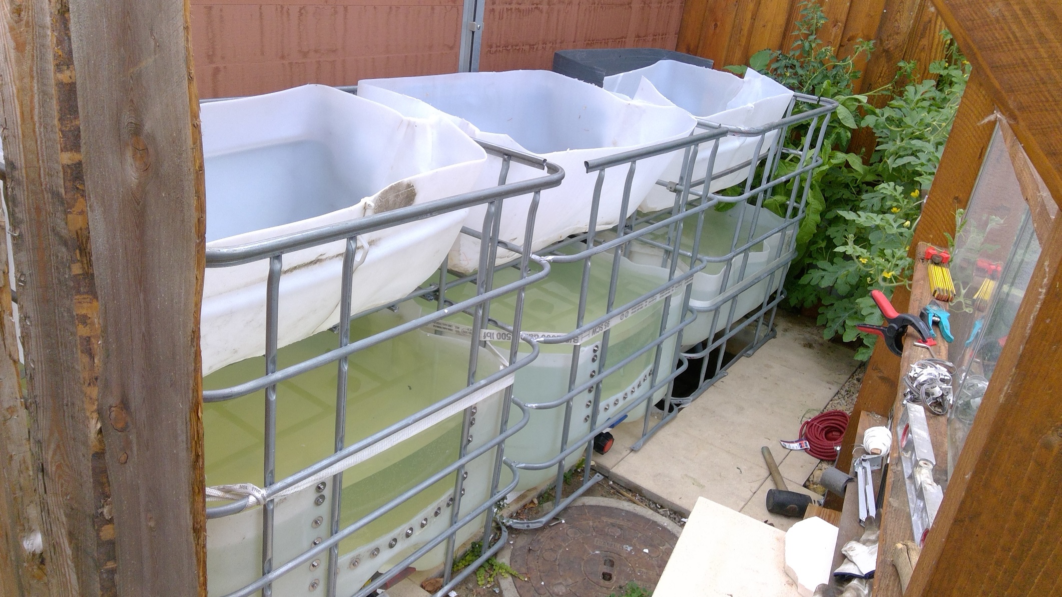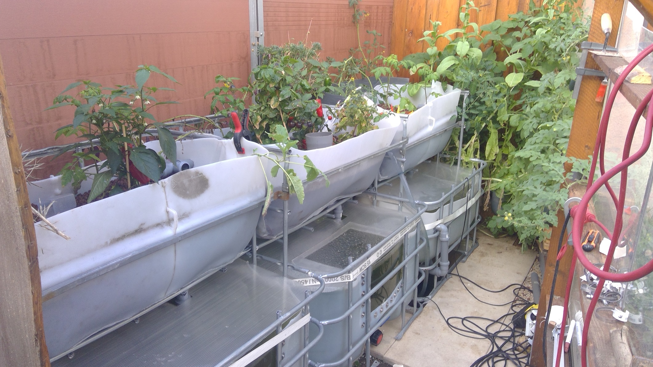 Das versprochene neue Video muss ich noch schuldig bleiben und das obwohl ich in der abgelaufenen Woche jeden Tag 10h mit Aufbauen beschäftigt war. Eigentlich wollte ich gestern die erste AP im Einfahrbetrieb haben aber für das ausstehende GW-Holzgewerk der Gesamtkonstruktion habe ich den größten Teil der Woche benötigt. Aktuell könnte ich Euch lediglich drei IBC-Körbe zeigen die jeweils auf bxhxl 1000x1000x800 reduziert sind und im neuen GW über dem Sumpftank stehen. Da in diesem Forum Jeder von Euch weiß wie ein IBC-Korb aussieht schenke ich mir das Foto. Ich bin allerdings „Guter Dinge“ und hoffe das ich im Laufe der nächsten 2 Wochen die ausstehenden 6 IBC-Tanks verschweißt bekomme. 3xEbbe-Flut, 1xFischtank - zzgl. 2x Fischtank mit Plexiglasscheiben ausrüsten, 1x Krebstank und 1x Regenwurm-Reaktor.