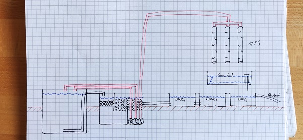 Das Gewächshaus wird auf Bodenniveau mit "DeepWaterContainern" bestückt. Sie werden über Rohre (kommunizierende Röhren) alle miteinander verbunden und münden schließlich im Filterbecken. Im Filterbecken und den DWC`s herrscht also überall der gleiche Wasserstand. Die Rohre werden in Bodennähe kontaktiert, sodass möglichst viel Volumen als Vorrat für den Filter/Sumpf wirkt (überhalb der Rohre), und ein Restvolumen im Notfall dafür sorgt, dass die DWC`s nicht komplett leerlaufen. Über den DWC`s wird der obere Teil des IBC-Containers (was vom Filterbecken übrig ist) als Growbed mit Ebbe/Flutsystem angebracht. Der Ablauf des Growbeds mündet im hintersten DWC. Über dem Growbed sollen "RainTowers" (oder wie man die Wasserrohre mit eingesteckten Netztöpfen nennt?) angebracht werden. Die dritte Pumpe soll Wasser vom Filterbecken zu den oberen Enden der RT`s pumpen, von wo aus es sich seinen Weg zurück durch die RT`s, das Growbed und die DWC`s in das Filterbecken bahnt.