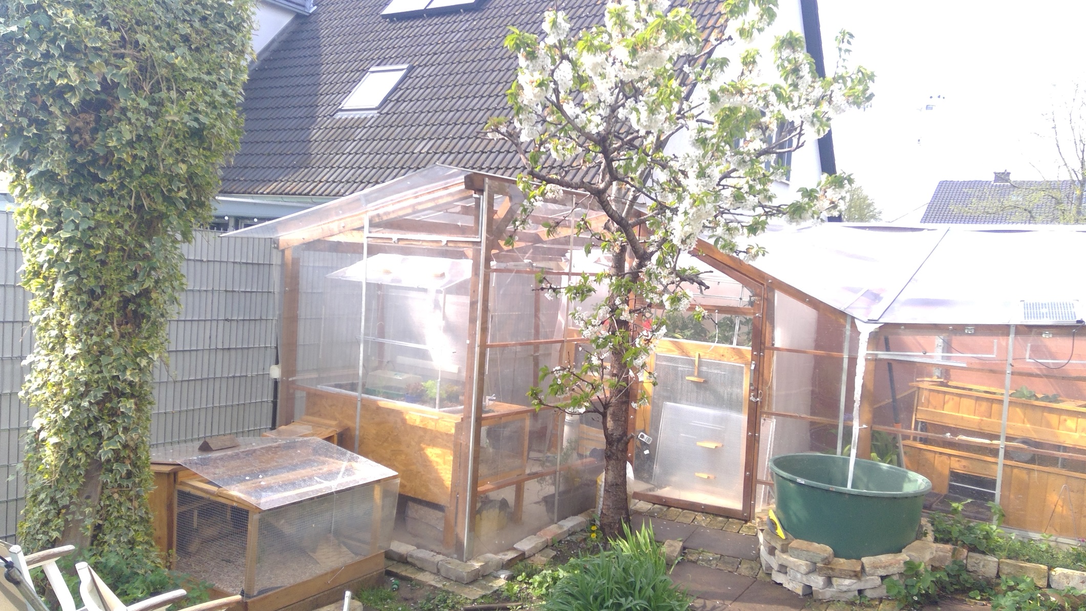 Aufgrund des hervorragenden Wachstums und der wirklich frühen Blüte der Drunter-Tomaten im GW der GW-APimGW ist mir bewusst geworden das ich eigentlich gar kein Anzucht-GW benötige. Im Herbst werde ich kleine Pflanztöpchen mit den gewünschten Pflanzen vorbereiten, trocken stellen und im Januar einfach in das GW der GW-APimGW stellen und der Pflanzen harren die da keimen. Für das Anzucht-GW wird mir schon noch was einfallen, zum Beispiel im Winter Weizengras für die Wachteln züchten. Das An-GW hat schließlich Bodenheizung.