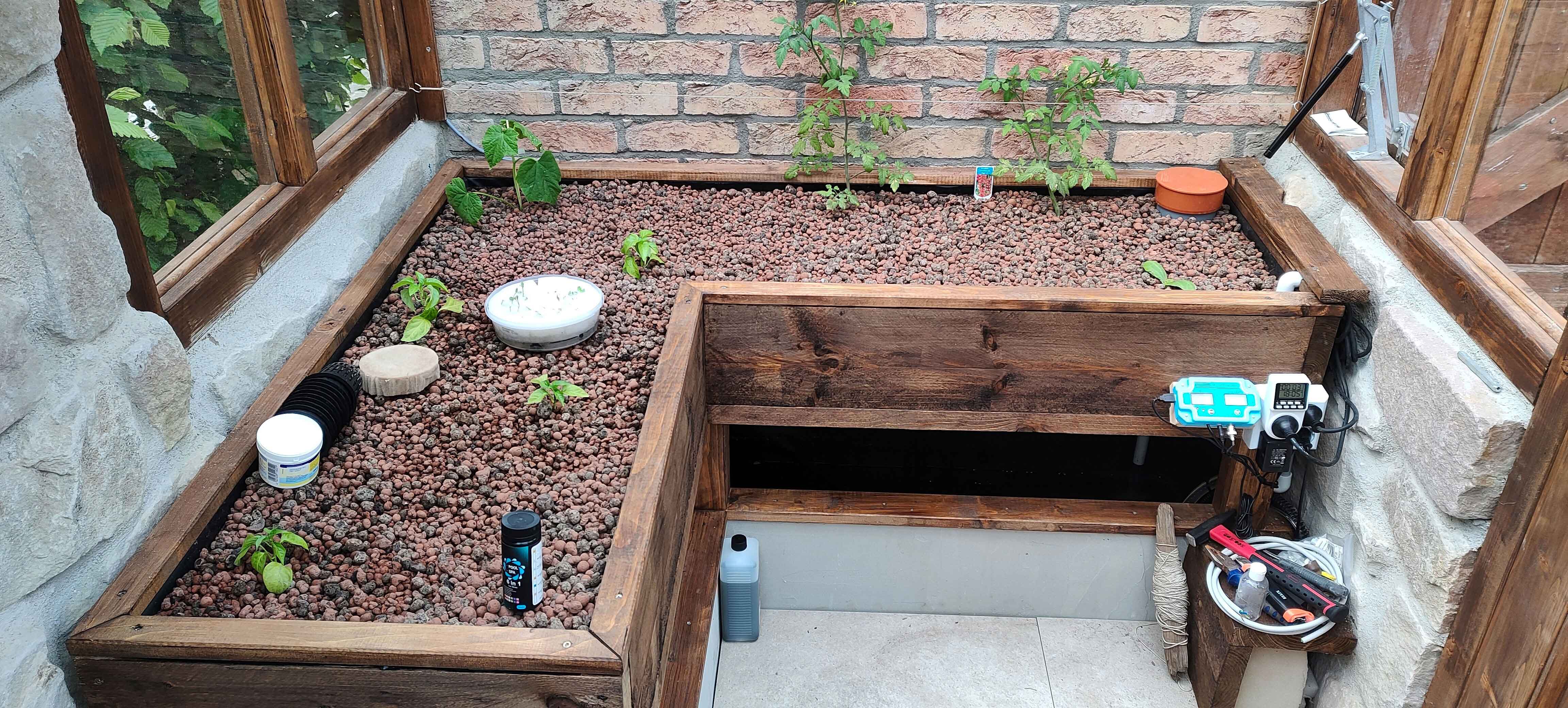 a circa. Habe zwei kleine Pumpen (regelbar bis 3000l/h) drin. Die eine füllt alle 20 Min. das Ebbe-Flut-System. Die andere pumpt das Wasser in den Teichfilter und in das NFT-System (über Durchflussregler aufgeteilt).