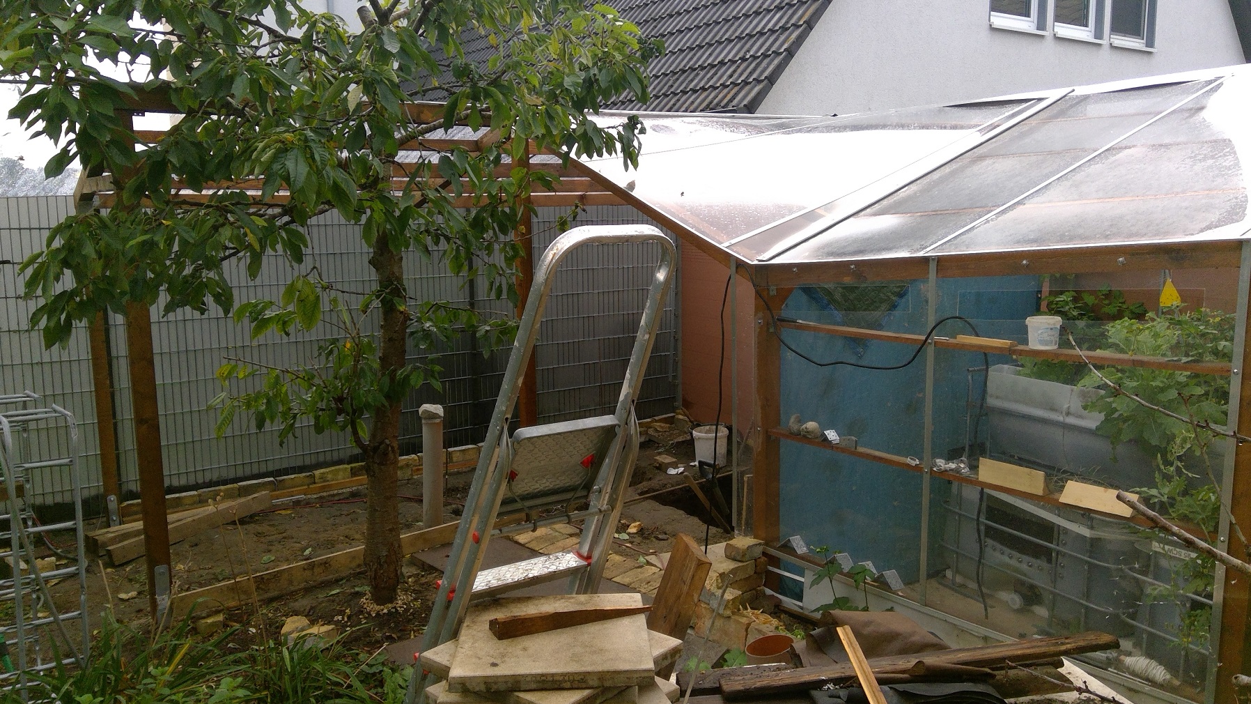 Noch ein letzter Satz zu den Riesen-Tomatenstecklingen: Wir sind am Ernten! Die Stecklinge samt der bereits fast ausgewachsenen Tomaten sind angewachsen, die Tomaten werden reif und sind noch reichlichst am Blühen. Aber, um Stoff zu zitieren "Das Ende naht" denn Ende des Monats ist mit 100% Sicherheit Schluß da ich radikal ausgeizen werde und nur noch die angesetzten Tomaten reifen dürfen. Aus Erfahrung schmecken im November geerntete Tomaten zum Fürchten. In der Folge ist ab November Baby-PakChoi Zeit und die vorgezogenen Pflanzen werden den Platz der Tomaten einnehmen. Vielleicht auch noch Porree, der allerdings nur weil der wunderschöne Blüten im Frühjahr treibt. Für Porree als Hauptmahlzeit haben wir noch kein wirklich gutes Rezept gefunden, gerne mal in die Quiche oder die Tart aber dann reicht es auch für 2 Monate. Weiter News wahrscheinlich am Sonntag mal schauen wie weit ich kommen. Sind dann aber nur GW-Bau Infos da ich noch ein ziemliches Stück Arbeit vor mir habe bis ich mit dem neuen isoliertem Tillie-System anfangen kann. Gruß Stephan RE: Das 1´ste Jahr - Stephan - 03.10.2023 Hallo Zusammen hier die angedrohten GW-Bau Infos, allerdings deutlich später als geplant. Irgendwie kommt immer neuer Fummelkram dazu und es müssen irgendwelche nicht bedachten Absonderlichkeiten gelöst werden. Besonders doof, beim Ausheben des Erdreichs für den Pumpensumpf bin ich bei 40cm Tiefe, geplant waren 50cm Tiefe, auf einen riesigen Betonklotz gestoßen so da ich jetzt den Pumpensumpf entsprechend verkleinern muss, ansonsten würde lediglich eine Sprengung helfen. Auf Bild 1 das seit heute, dank meines sehr dultsamen Nachbarn, komplett eingedeckt Dach. Endlich kann ich mit den Buddelarbeiten weiter machen und das auch bei Regen ohne gleich im Schlamm zu versinken. Der Teil des GW ist 1,8m breit und 4,5m lang. Auf Bild 2, sehr romatisch vom Sonnenuntergang angeleuchtet unsere Treppenleiter ;-) Im Hintergrund ist dann das GW nahezu vollständig zu sehen. Die Länge der Rückfront sind 7,5m. Die aktuellen Kosten für die Tillies in der nicht isolierten AP belaufen sich nach 21 Tagen auf 2,88€/Tag und sind glücklicherweise niedriger als befürchtet. Aber wie bereits geschrieben die Wetter-Uhr tickt und ich werde jetzt mit Hochdruck den Bau des isolierten AP-Systems vorantreiben da vor allem, ebenfalls seit heute, der 600l IBC auf dem Hof steht der will schließlich unter dem neuen System geparkt werden. Bei der begonnen Buddelei für den 600l IBC habe ich eine schicke Reihe von Pflanzsteinen, diese Betonringe für Uferbefestigungen, freigelegt. Die sind kein Problem und mit dem Vorschlaghammer zu beseitigen. Drückt mir die Daumen das nicht noch mehr Beton-Irgendwase auftauchen. Mittlerweile haben sich die Tillies an das neue Zuhause gewöhnt und fressen wieder wie gewohnt. Die bleiben sogar vor der Scheibe kleben wenn wir zum Blumen giesen an dem Tank vorbeigehen. Das soll erstmal wieder reichen. Gruß Stephan RE: Das 1´ste Jahr - Stephan - 11.10.2023 Hallo Zusammen, hier die neuesten News aus unserer neuen AP! Unser neues Kalt-AP-System, in welchem aktuell die Tillies zwischen-geparkt sind, hat sich überlegt herum zu zicken und wir hatten seit geraumer Zeit einen Wasserverlust von ca. 100l/Tag. Das ist erstmal nicht tragisch da Wasser in einem GW zu verteilen als gießen bezeichnet wird und zu keinen Folgeschäden führt. Bei den aktuellen Temperaturen ist es jedoch doof jeden Tag 100l Wasser von 13°C auf 23°C hochzuheizen und somit war heute - mit folgendem Ergebnis - die Fehlersuche angesagt: