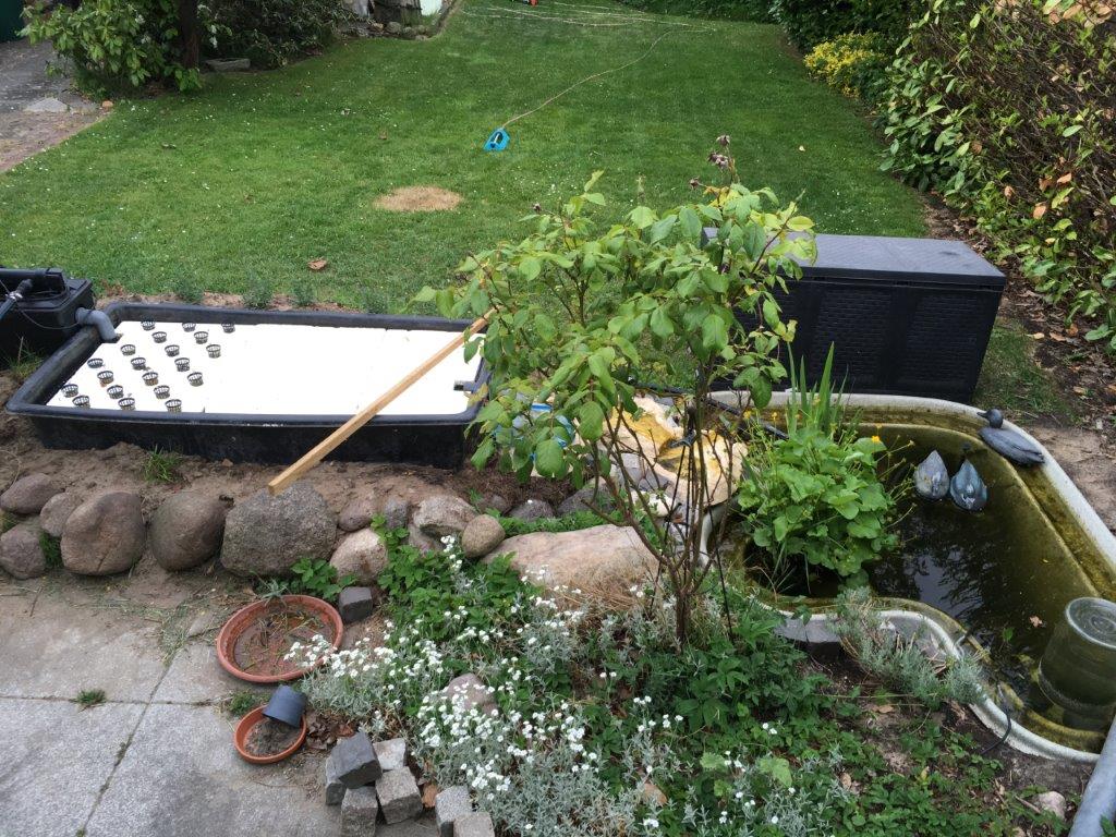 Aktuell habe ich ein DWT - System und einen eingelassenen Teich. Ich habe mir gedacht, sollte ich kein Glück mit der Aquaponik Anlage haben so bleibt ein schöner Teich über - außerdem hat dieser Bodenkontakt und reguliert somit die Temperatur im Gesamtsystem.