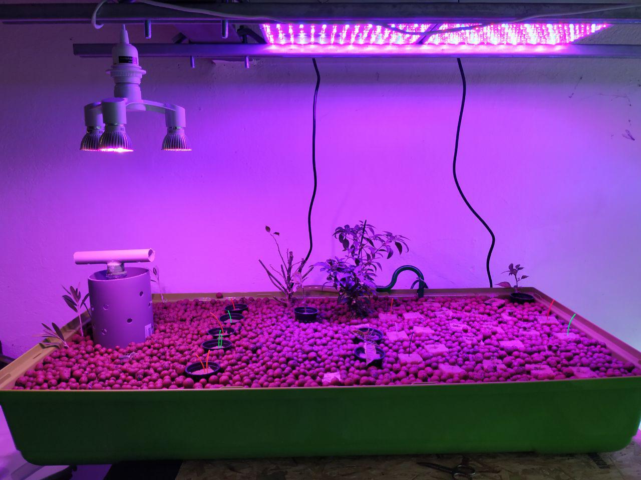 Betrieben wird das ganze bisher mit meiner "alten" Aquarium-Pumpe und einigen LED-Growlampen.